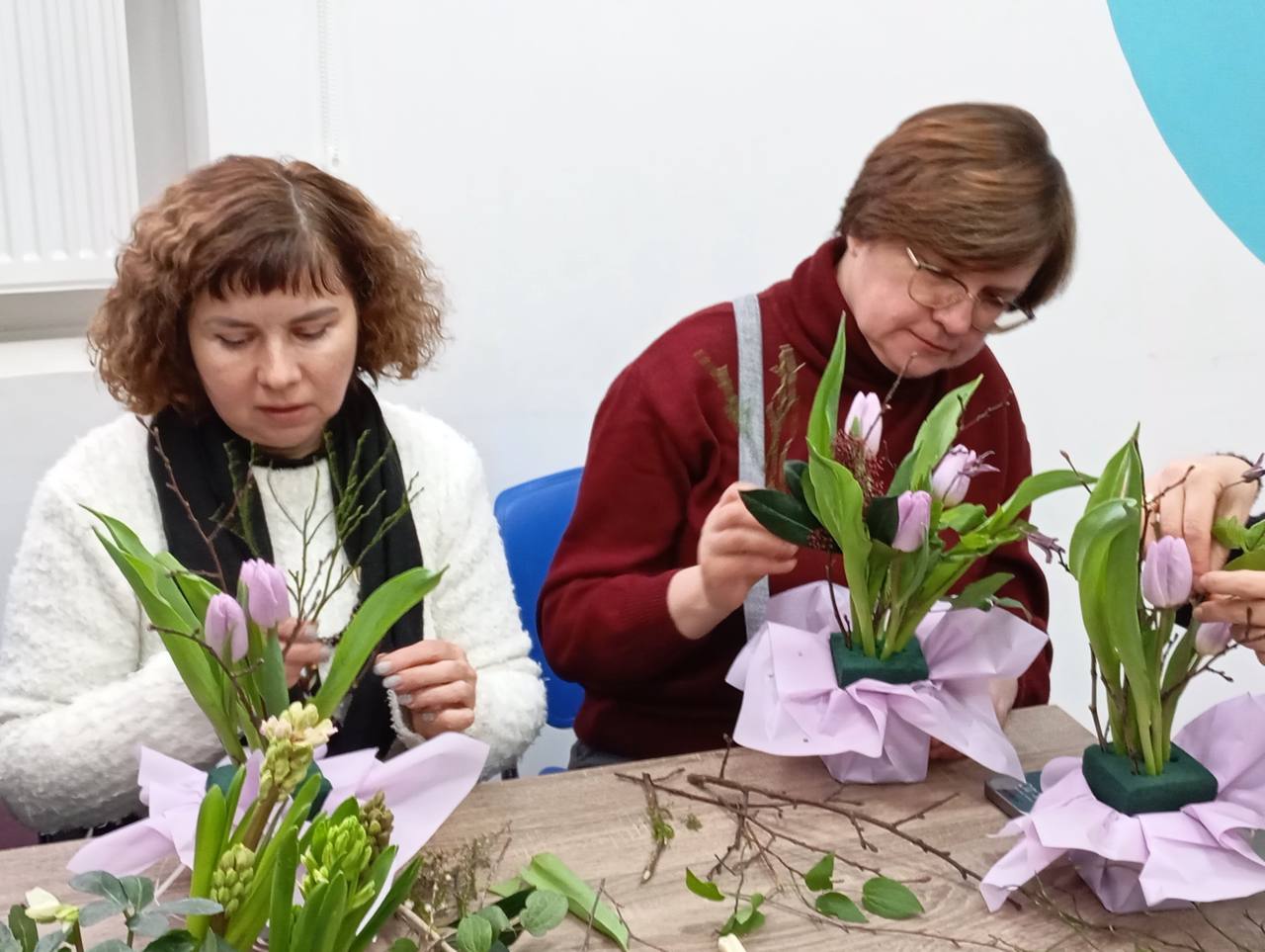 За роботою над композиціями учасниці ніби перемикалися з тривог на красу: обирали деталі, складали квіти, підбирали гілочки, і створювали маленькі «острівці» весни серед зими.